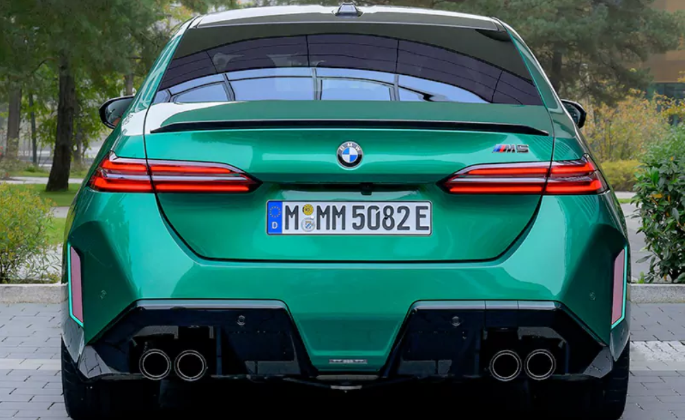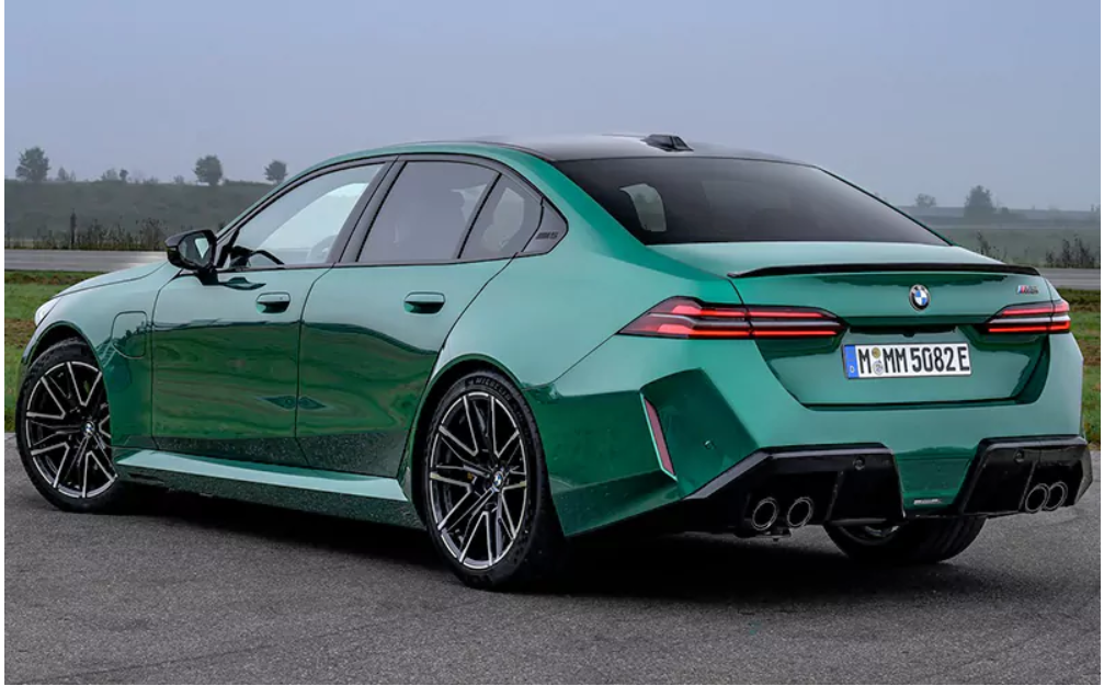 چراغهای LED جدید با ترکیب نورهای بالا و پایین در یک قاب، ظاهری مدرن و متمرکز دارند. در نمای جانبی، خطوط تیز و عضلانی بدنه، همراه با لوگوی M5 روی ستون D و طراحی خاص هوفمایستر، به خودرو شخصیتی متمایز میبخشند. رینگهای دوپره M با اندازههای ۲۰ اینچ در جلو و ۲۱ اینچ در عقب، همراه با لاستیکهای اختصاصی، ظاهر قدرتمند این سدان را تقویت میکنند و باعث میشوند چسبندگی بیشتری به سطح جاده داشته باشد. این لاستیکها با ترکیبات الهامگرفته از فرمول یک، عملکرد و دوام بهتری ارائه میدهند.