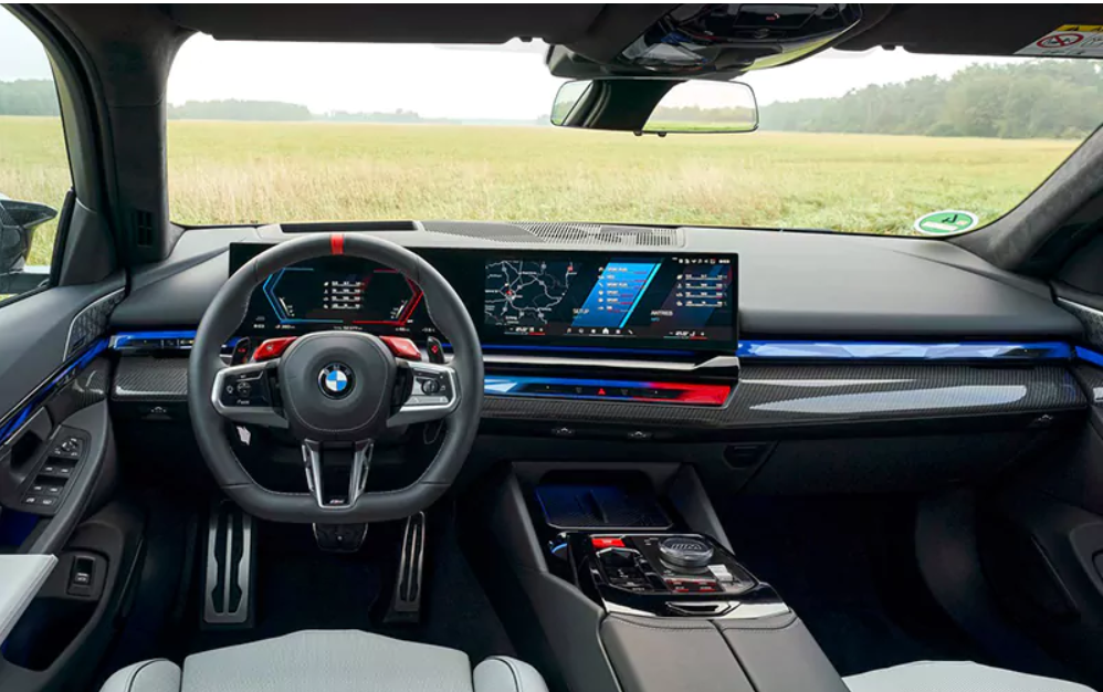 فضای داخلی بی ام و M5 ۲۰۲۵ ترکیبی از کابین لوکس سری ۷ و روح اسپرت محصولات M بی ام و است. کابین این خودرو، که میتوان آن را نسخه کوچکتر M7 یا مینی M7 نامید، با طراحی مدرن و فناوری پیشرفته، تجربهای هیجانانگیز ارائه میدهد. داشبورد با نمایشگر خمیده BMW، شامل صفحه نمایش ۱۲.۳ اینچی بهعنوان کلاستر پشت فرمان و ۱۴.۹ اینچی برای سیستم سرگرمی، نقطه کانونی کابین است. سیستم iDrive 8.5 با رابط QuickSelect، عملکرد سریع و کاربردی دارد و از Apple CarPlay و Android Auto و BMW Maps با امکان برنامهریزی مسیر بهینه برای کنترل شارژ سیستم هیبریدی پشتیبانی میکند.